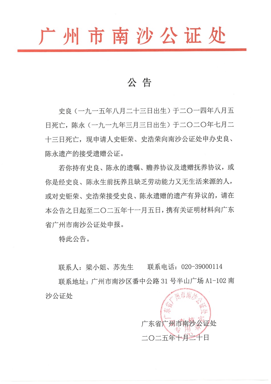 关于史钜荣、史浩荣接受史良、陈永遗赠的遗产的公告