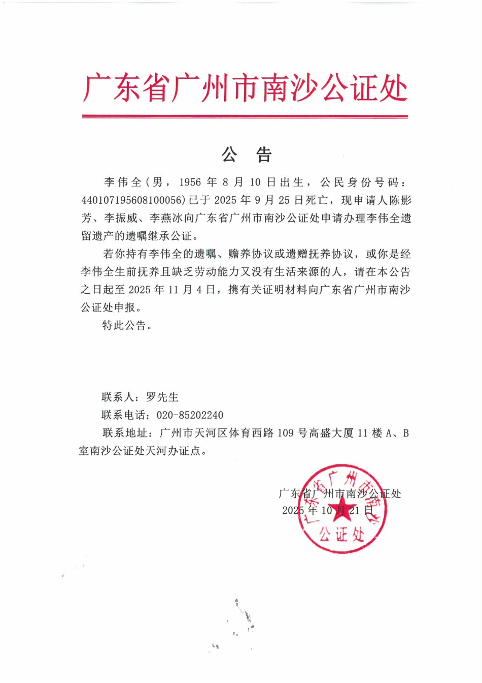 关于陈影芳、李振威、李燕冰继承李伟全遗产的公告