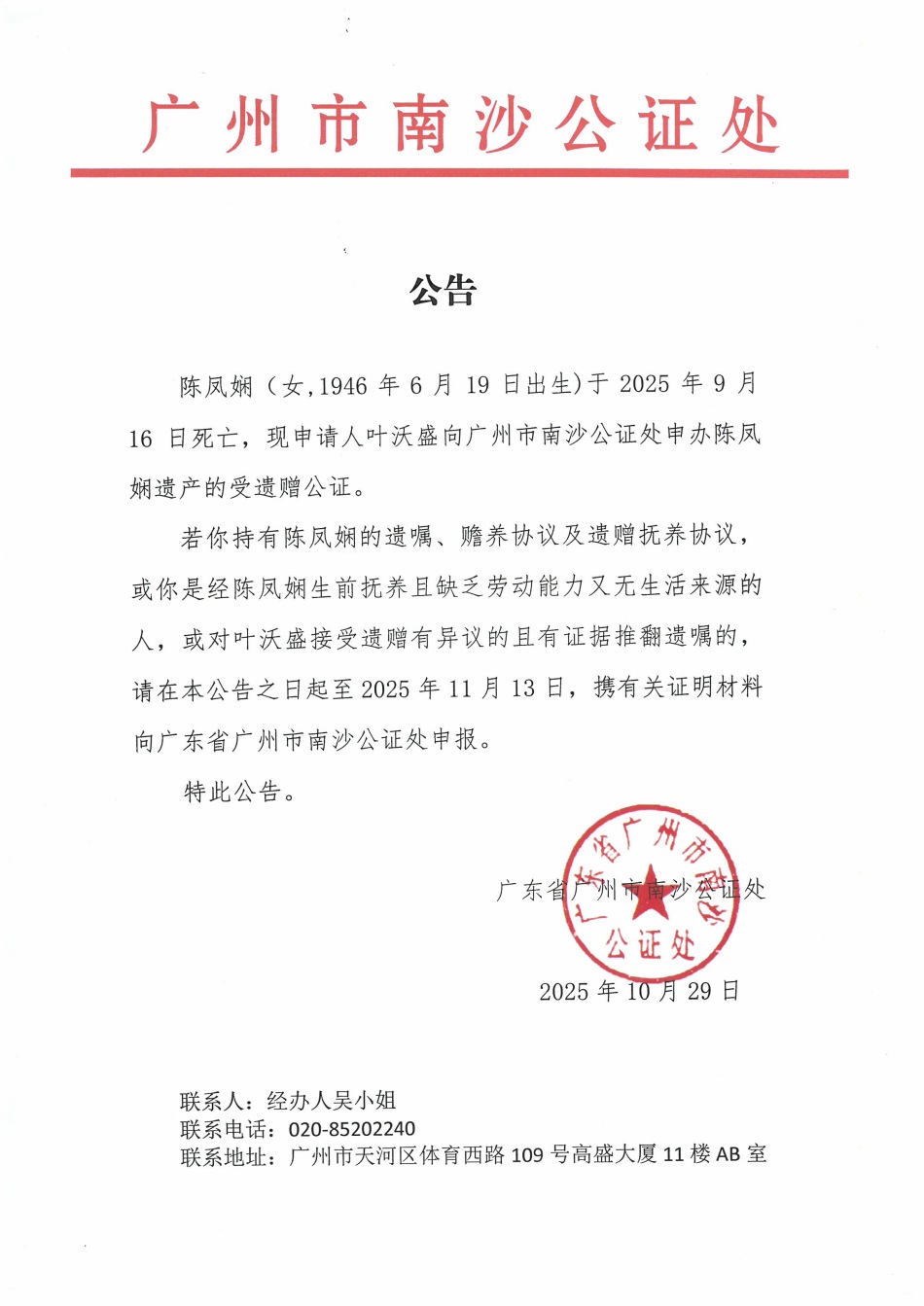 关于叶沃盛接受陈凤娴遗赠的公告