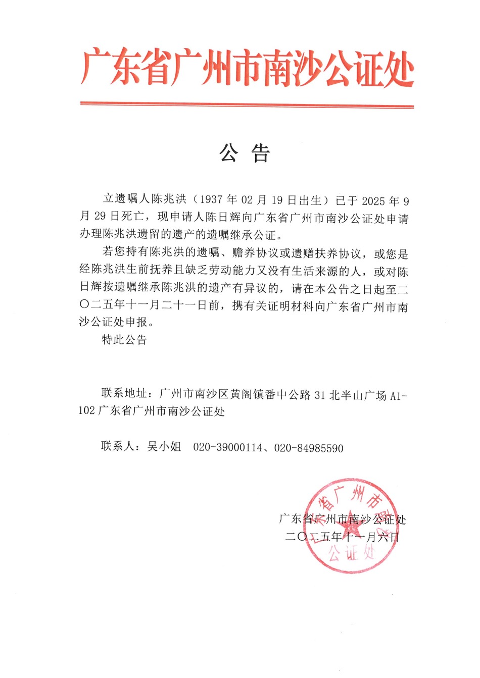 关于陈日辉办理陈兆洪的遗产继承公告