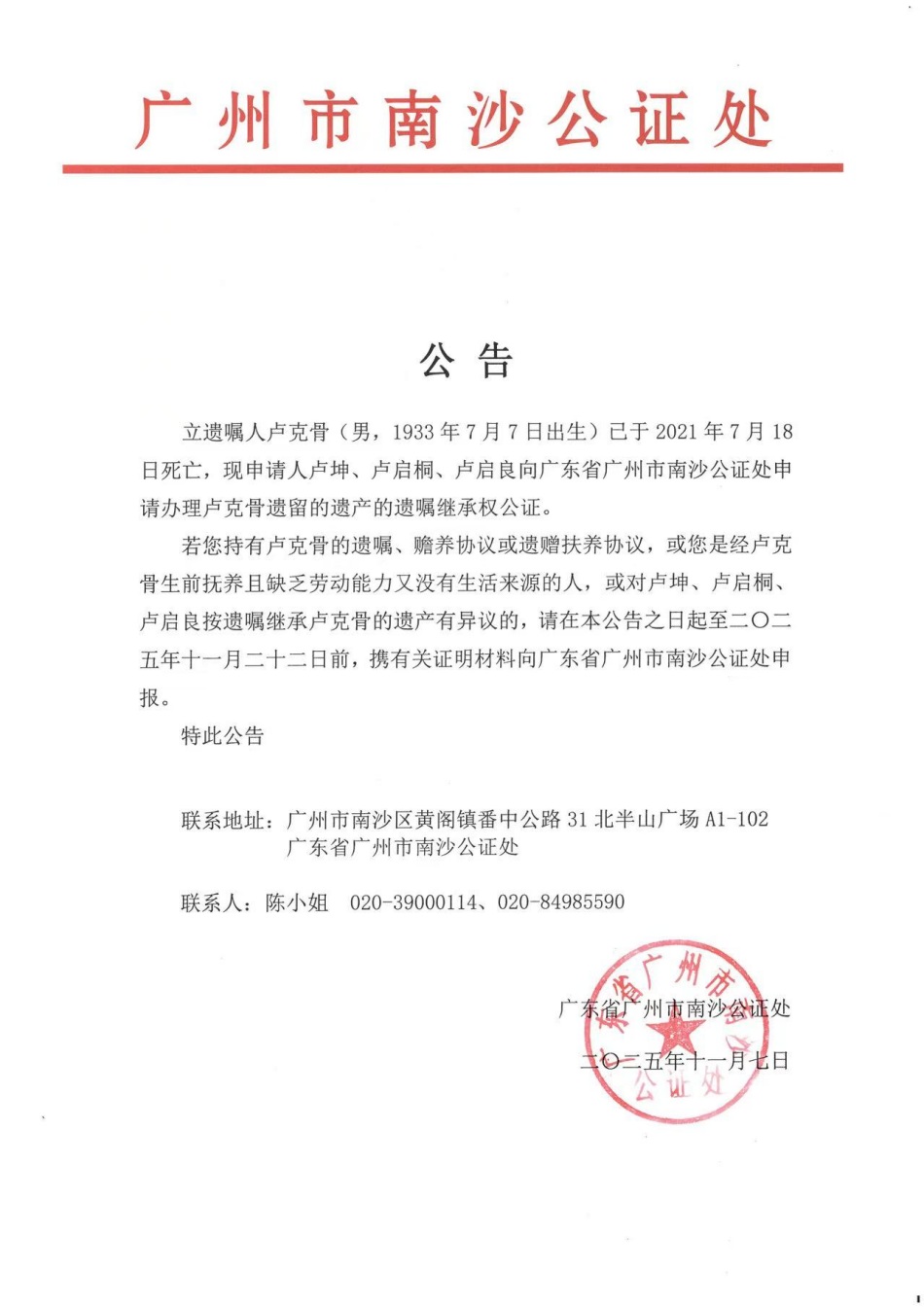 关于卢坤、卢启桐、卢启良继承卢克骨的遗产公告