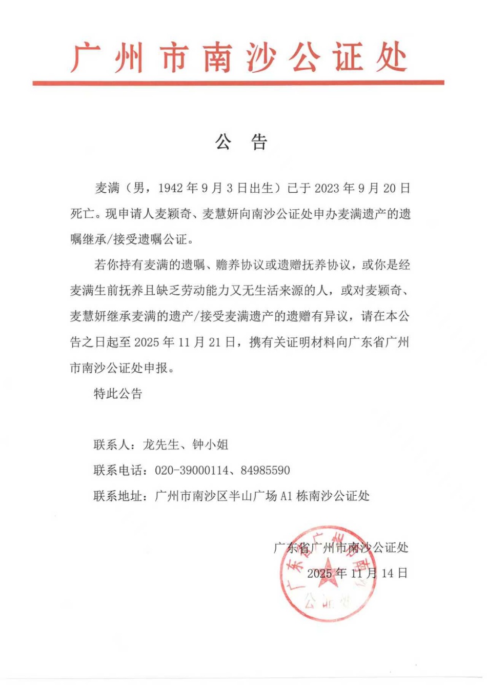 关于麦颖奇、麦慧妍继承/接受遗赠麦满遗产的公告