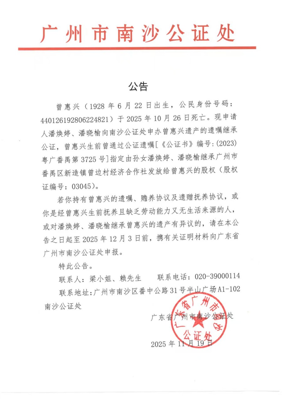 关于潘焕婷、潘晓榆继承曾惠兴遗产的公告