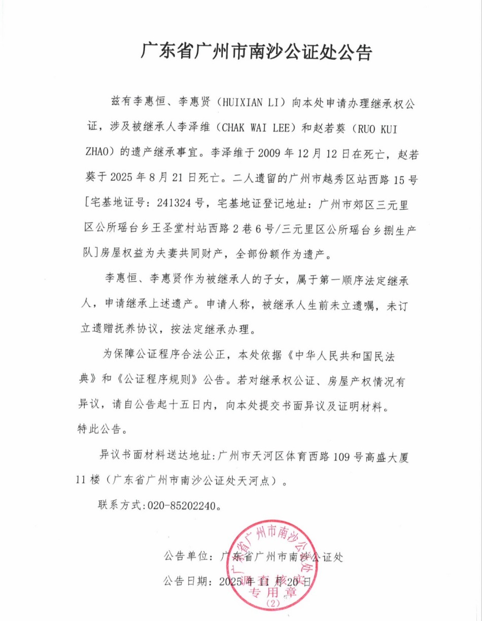 关于李惠恒、李惠贤(HUIXIAN LI)继承李泽维(CHAK WAI LEE)和赵若葵(RUO KUI ZHAO)遗产的公告