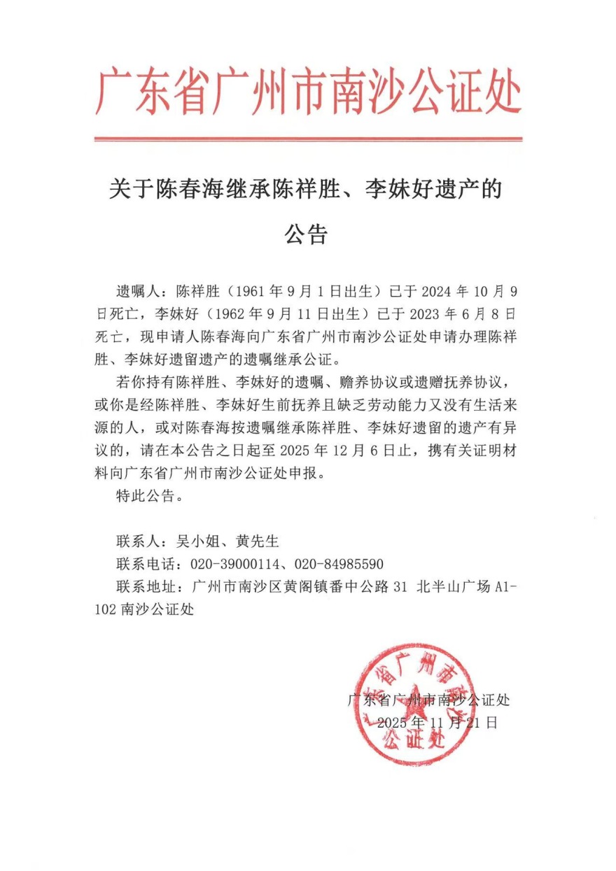 关于陈春海继承陈祥胜、李妹好遗产的公告