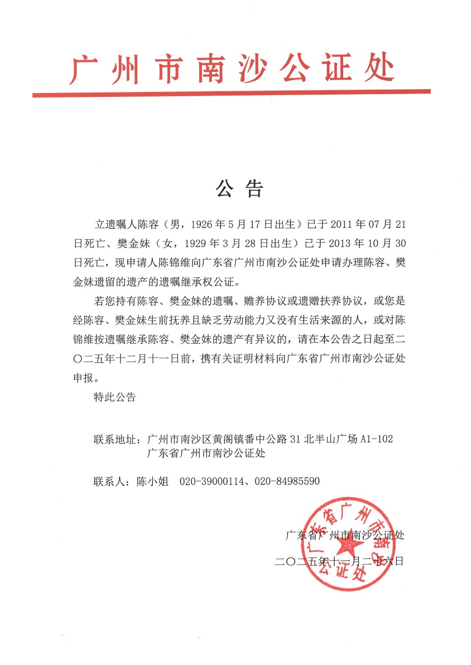关于陈锦维继承陈容、樊金妹的遗产公告