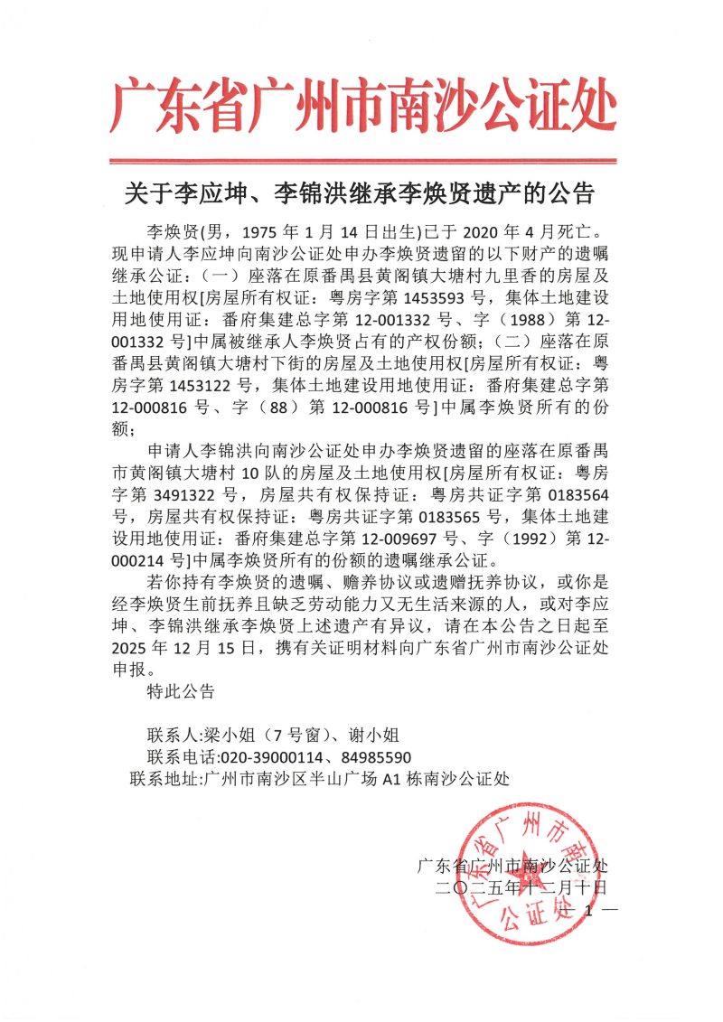 关于李应坤、李锦洪继承李焕贤遗产的公告