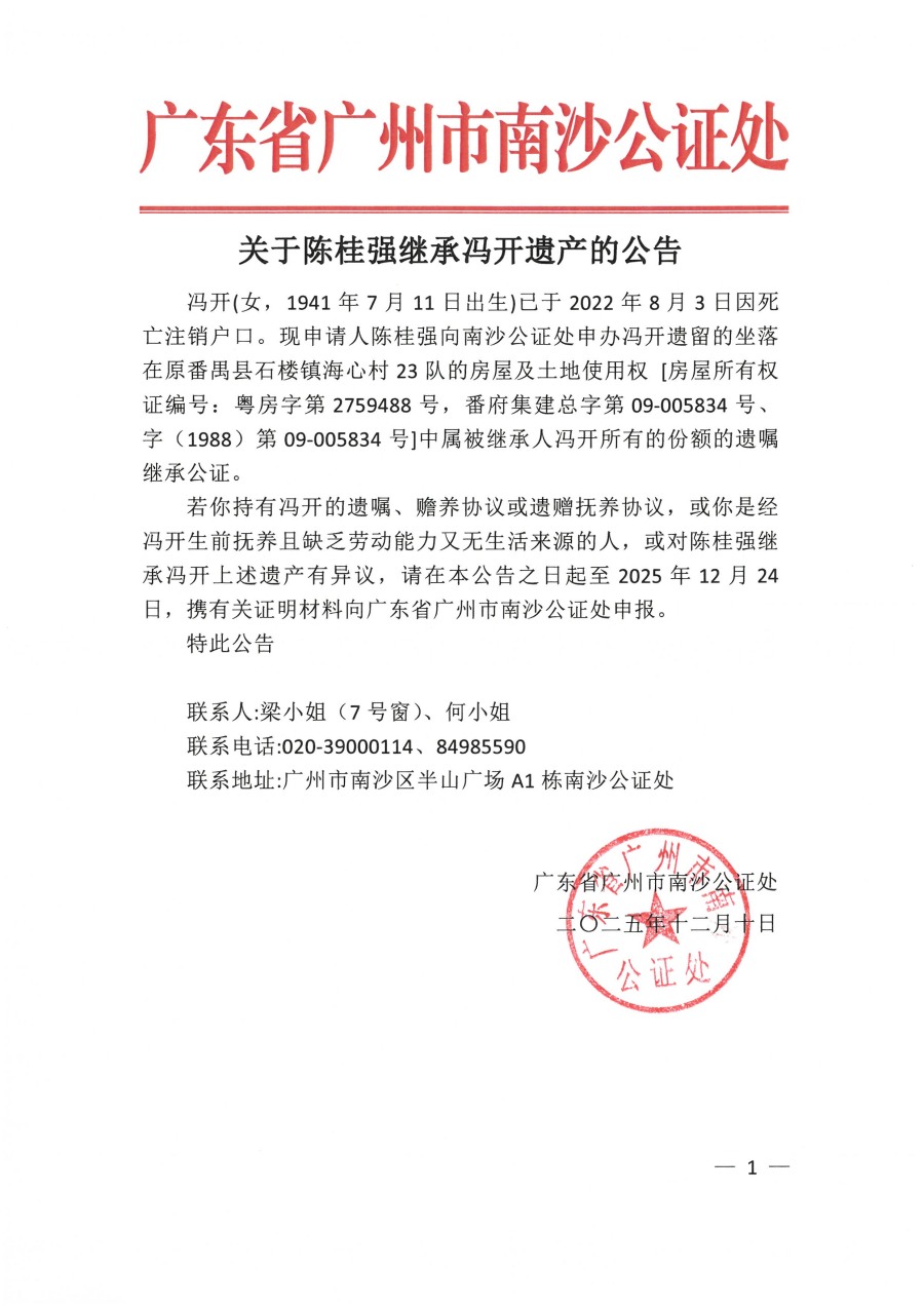关于陈桂强继承冯开遗产的公告