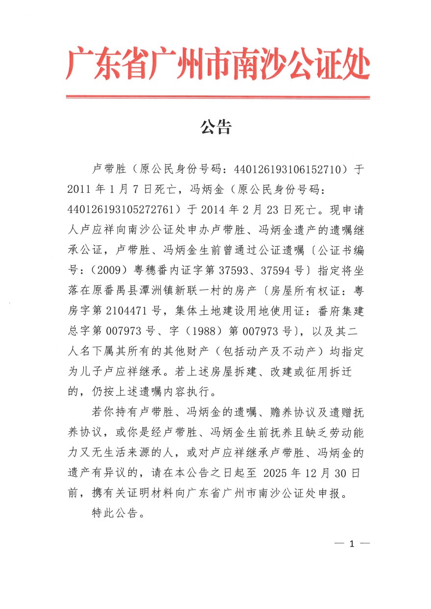 关于卢应祥继承卢带胜、冯炳金遗产的公告