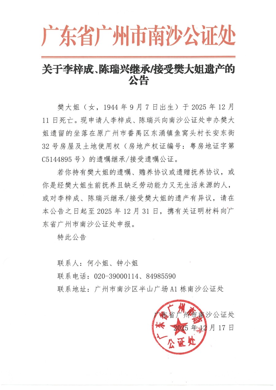 关于李梓成、陈瑞兴继承/接受樊大姐遗产的公告
