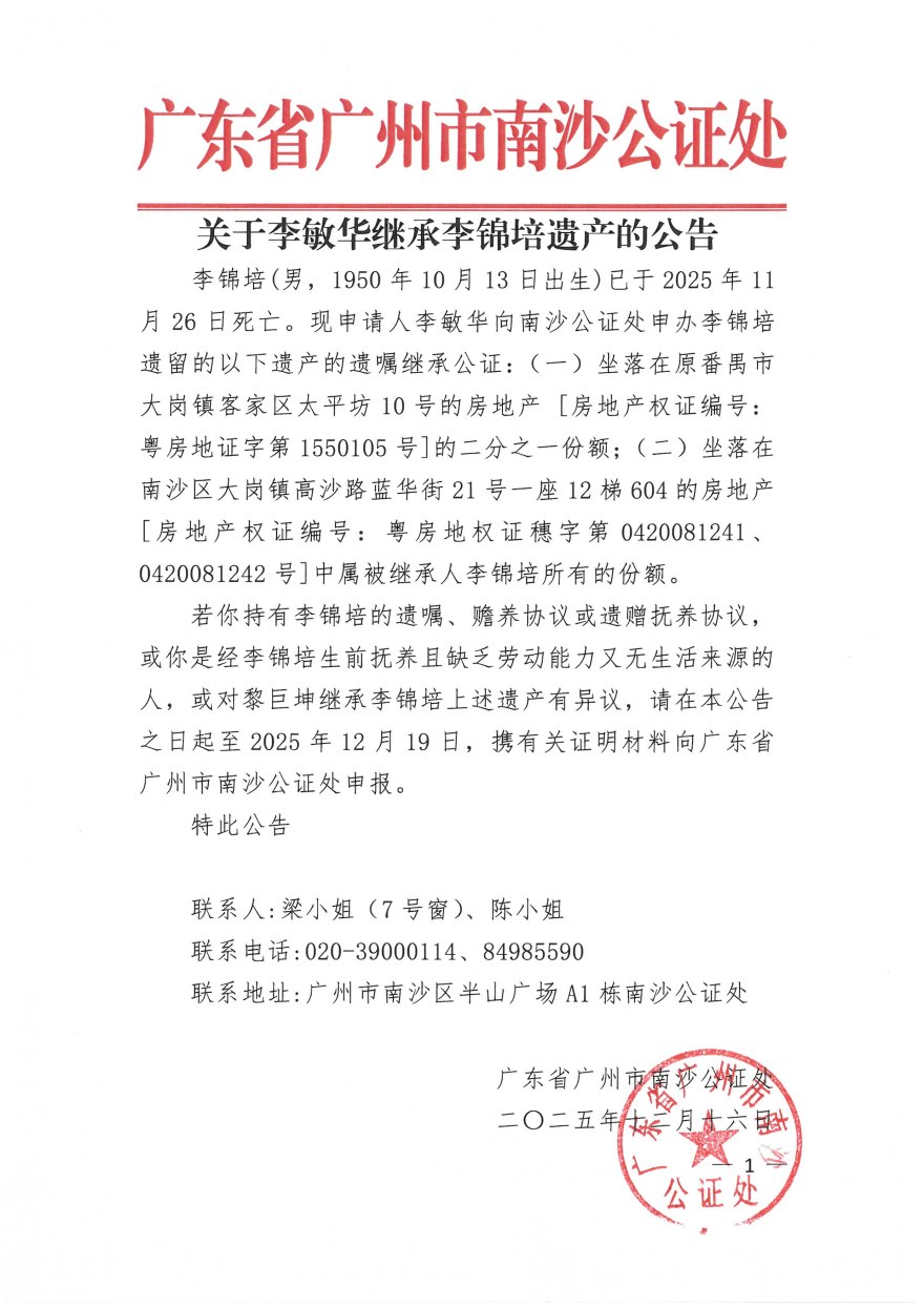 关于李敏华继承李锦培遗产的公告