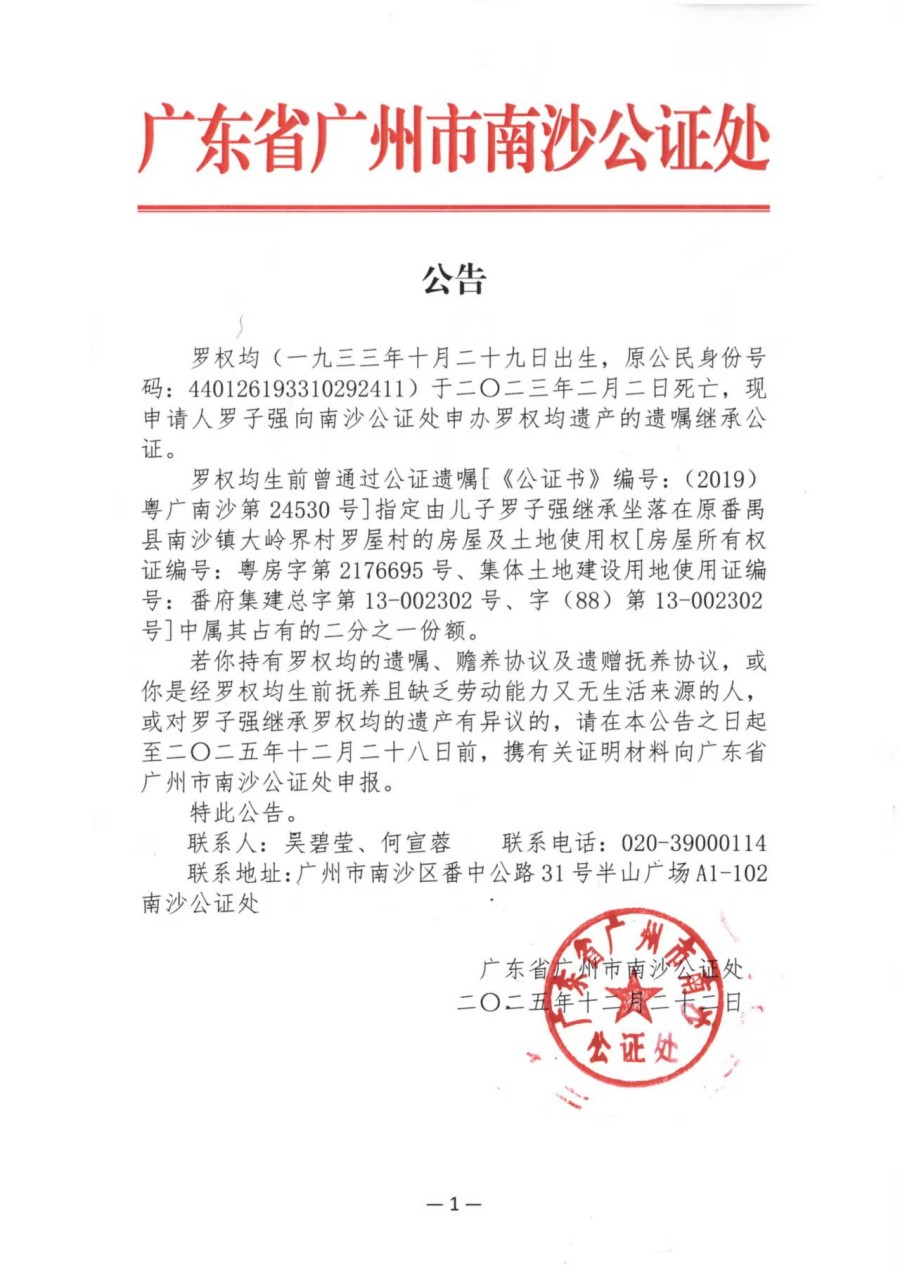 关于罗子强继承罗权均遗产的公告