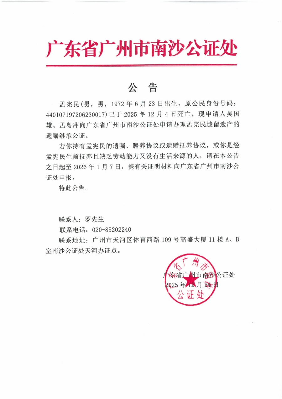 关于吴国雄、孟粤萍继承孟宪民遗产的公告