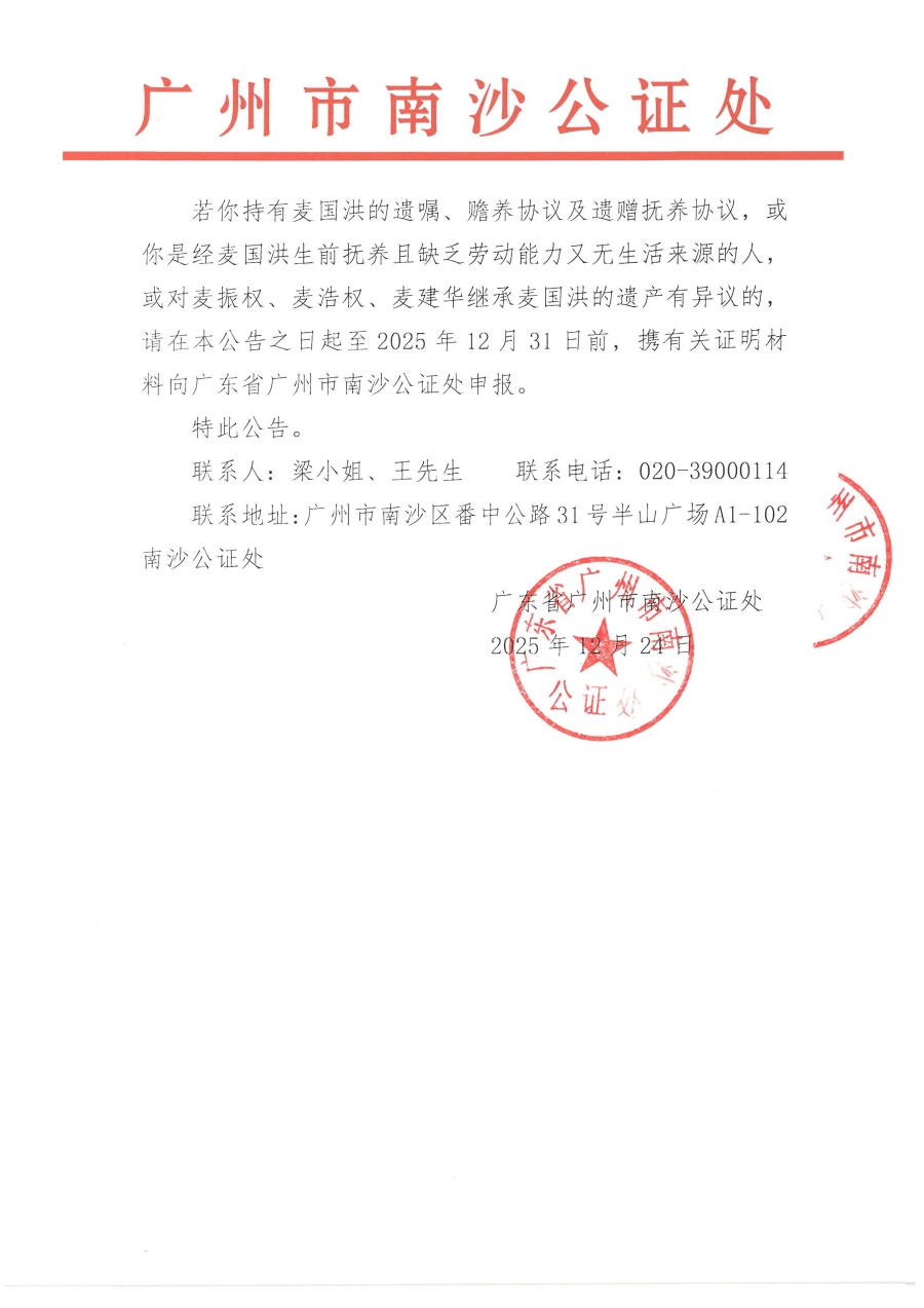 关于麦振权、麦浩权、麦建华继承麦国洪遗产的公告