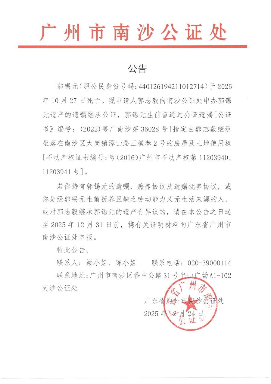 关于郭志毅继承郭锡元遗产的公告