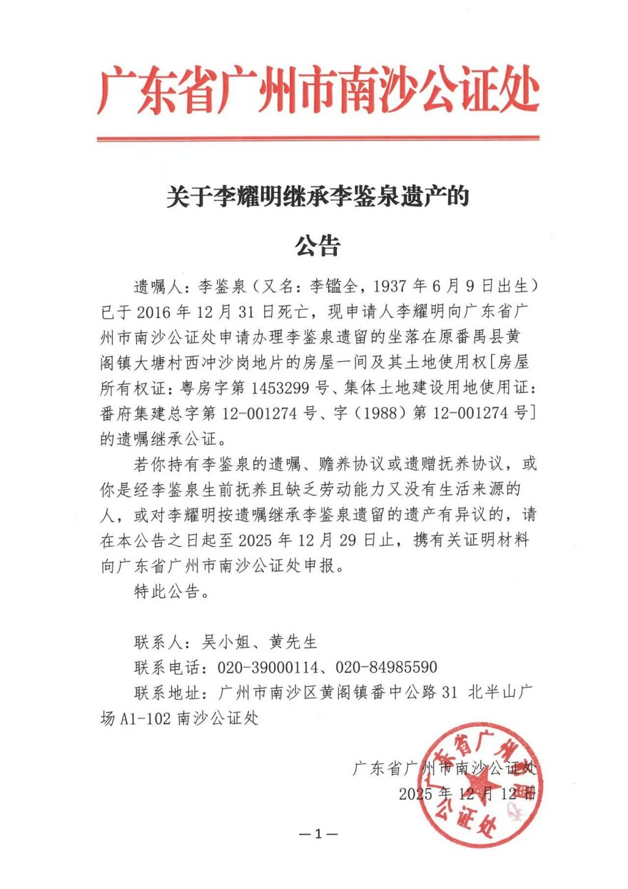 关于李耀明继承李鉴泉遗产的公告