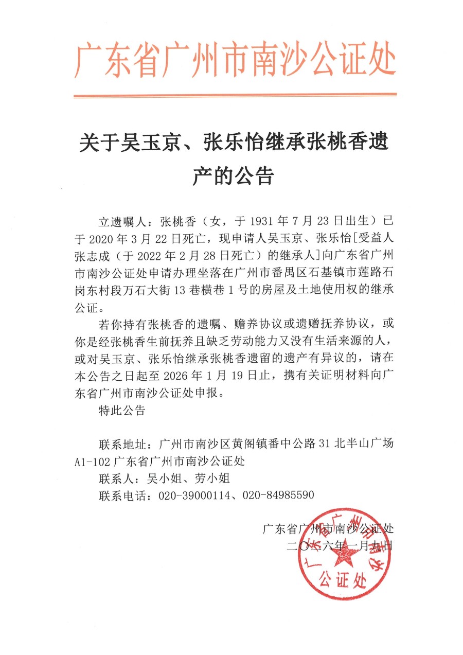 关于吴玉京、张乐怡继承张桃香遗产的公告
