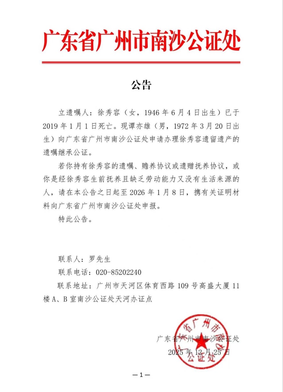 关于谭亦雄继承徐秀容(遗嘱继承)的遗产公告