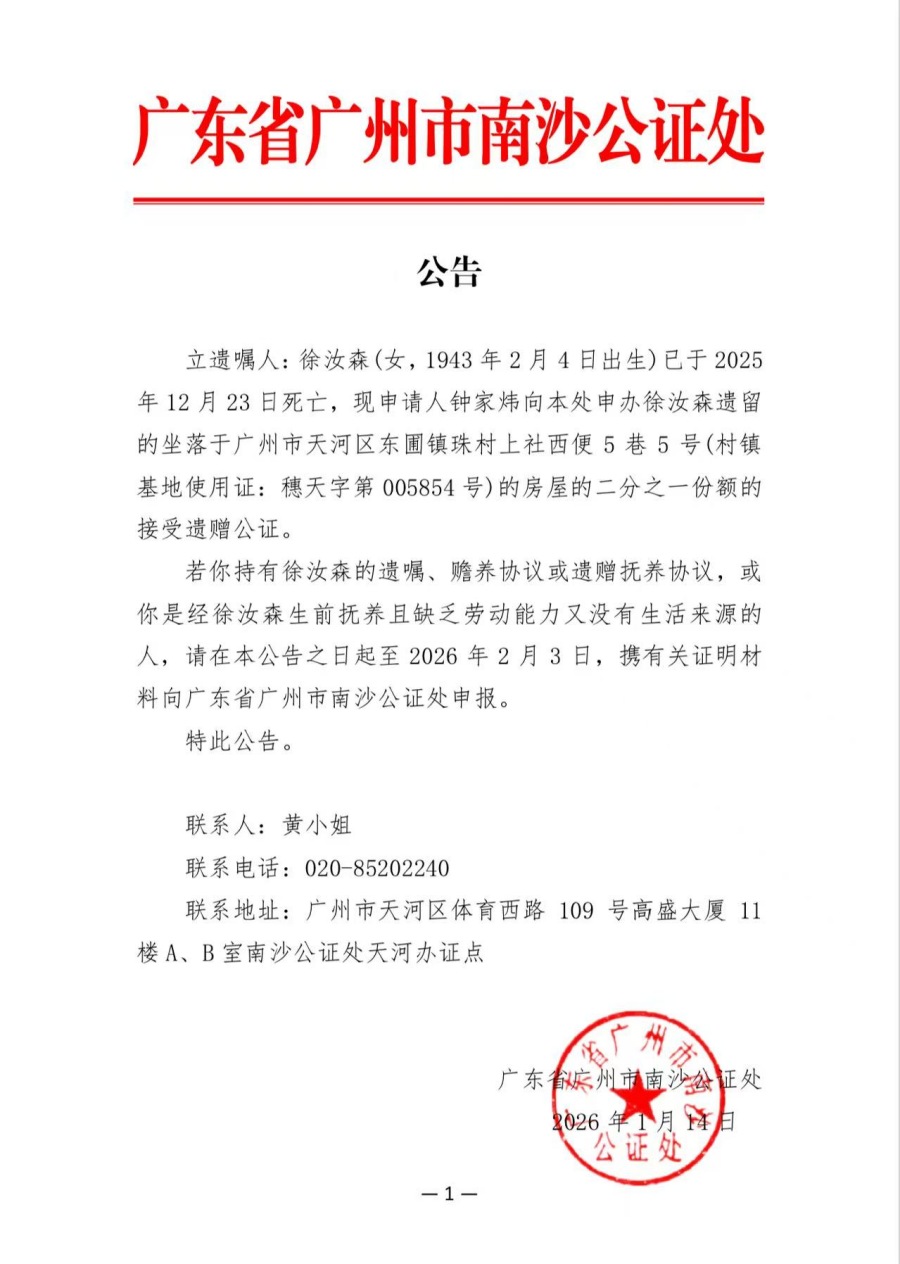 关于钟家炜受遗赠徐汝森其遗产的公告