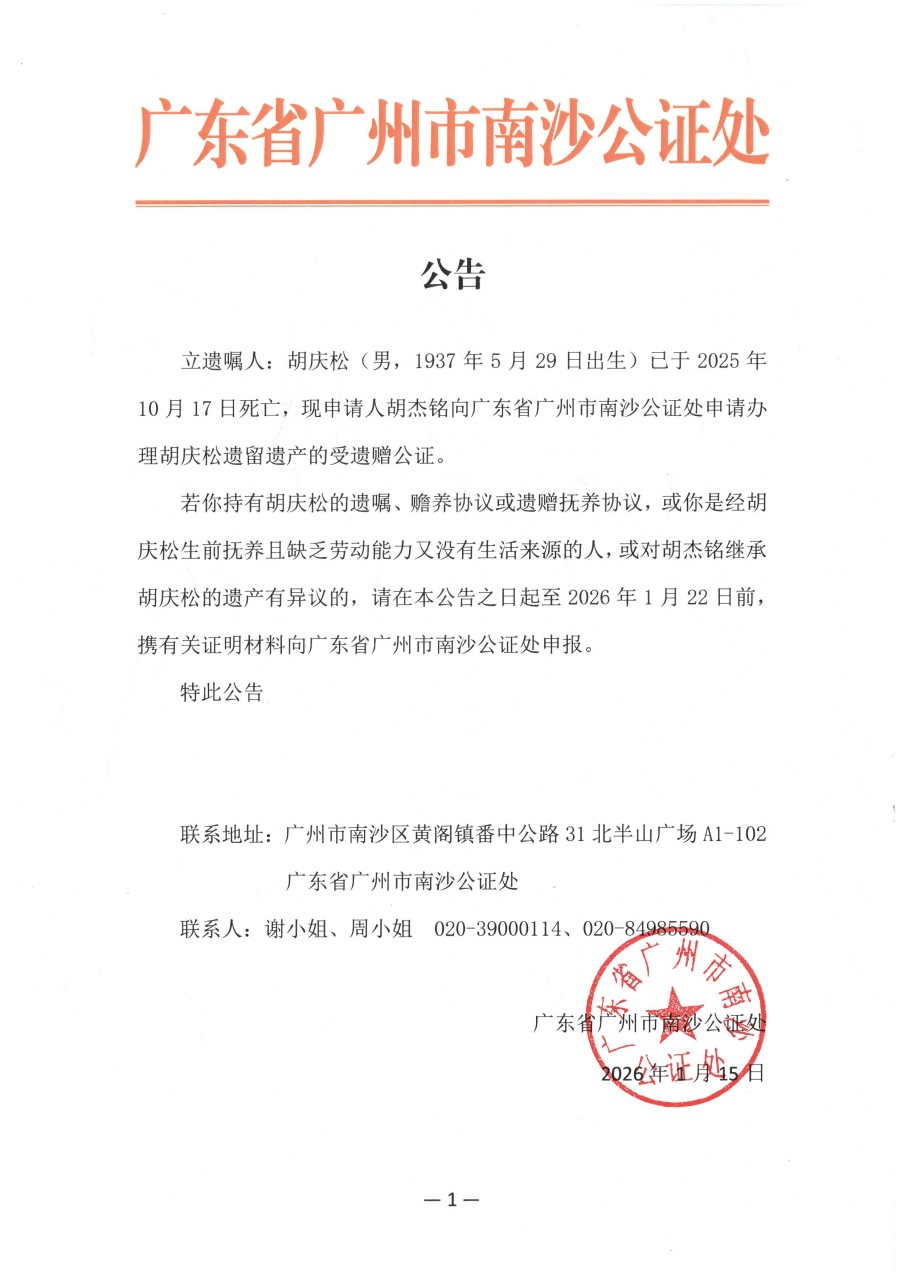 关于胡杰铭接受胡庆松遗赠的公告