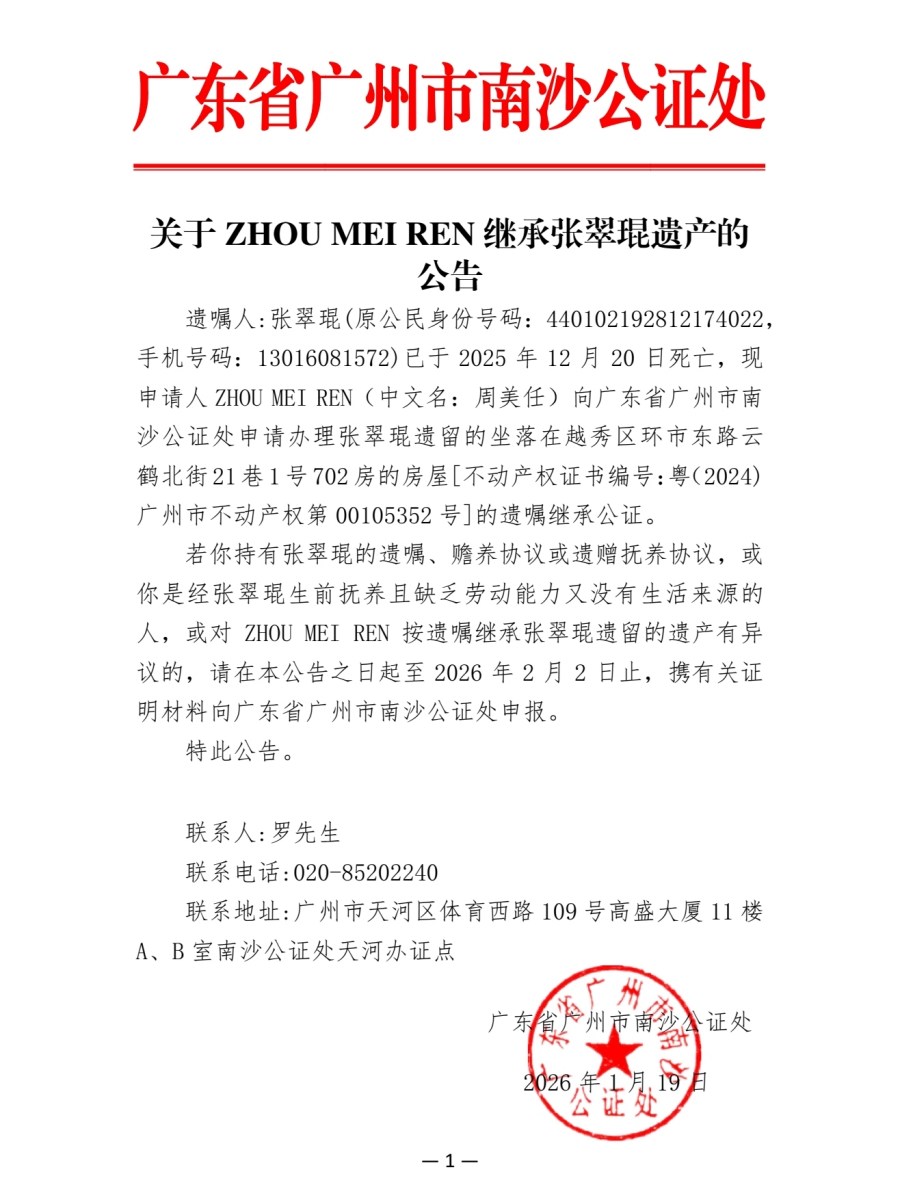关于ZHOU MEI REN继承张翠琨遗产的公告