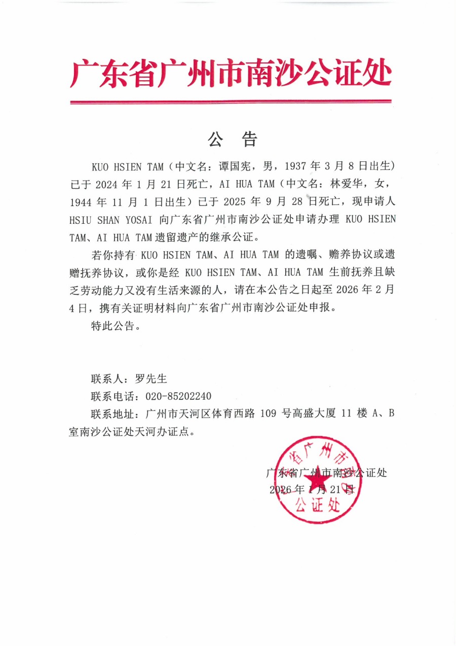 关于HSIU SHAN YOSAI继承KUO HSIEN TAM、AI HUA TAM遗产的公告