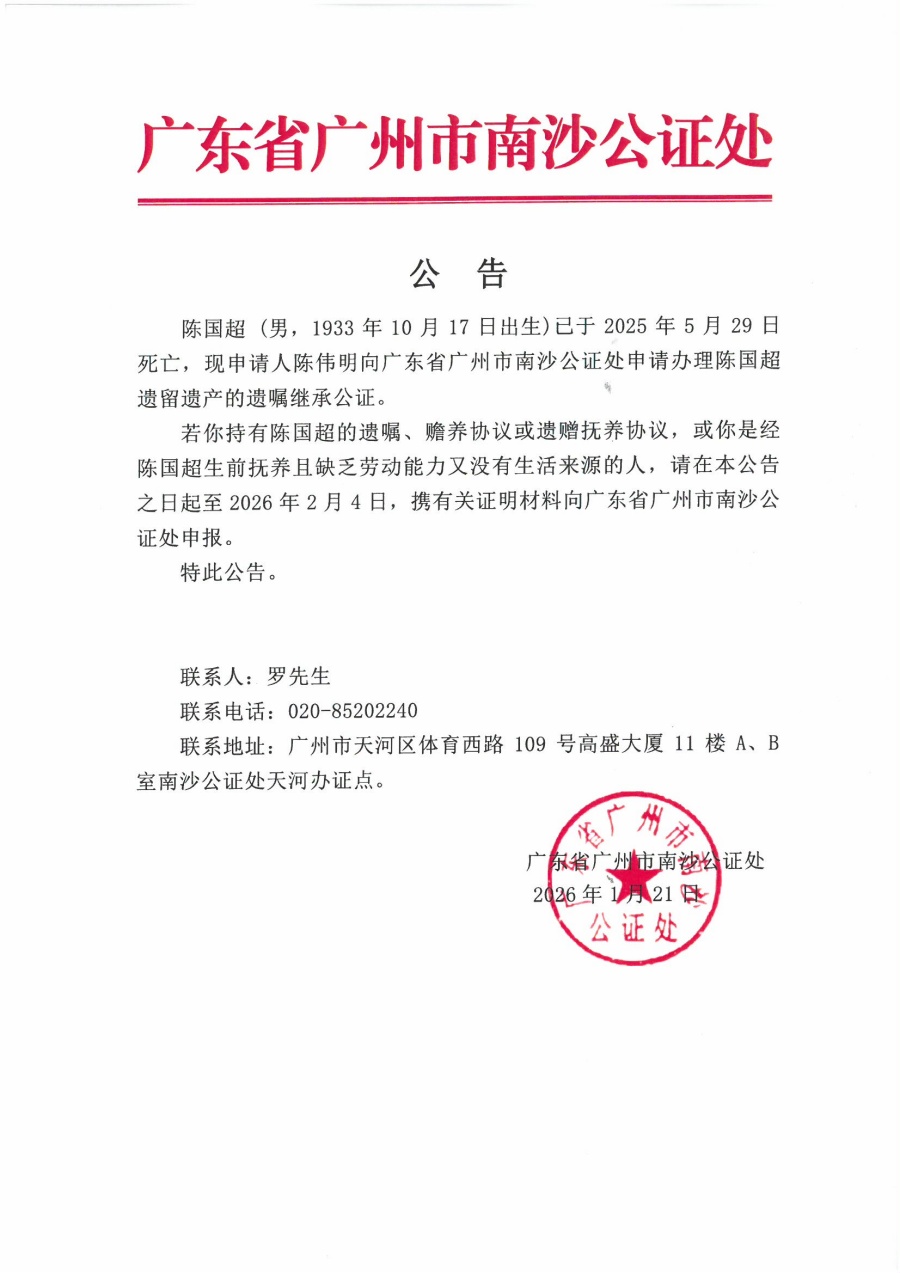 关于陈伟明继承陈国超遗产的公告