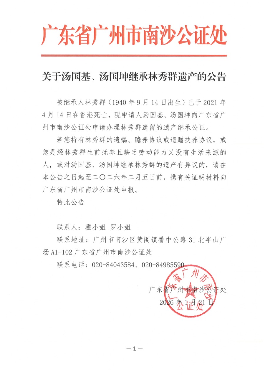 关于汤国基、汤国坤继承林秀群遗产的公告
