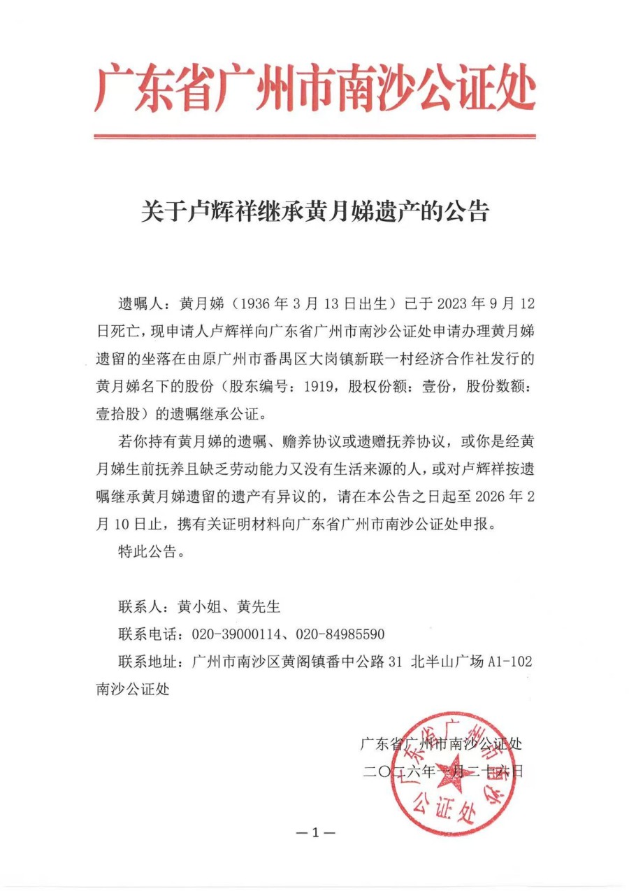 关于卢辉祥继承黄月娣遗产的公告