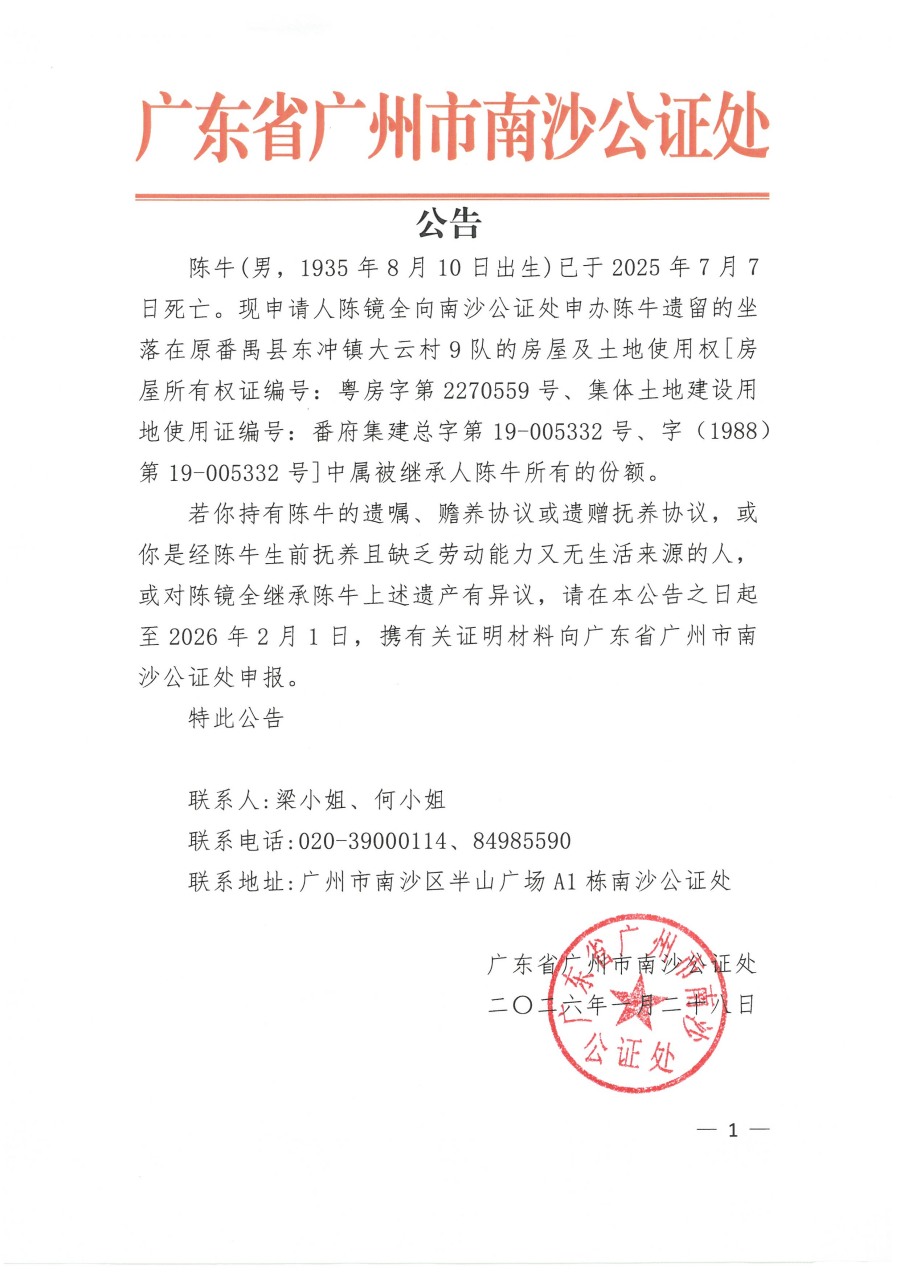 关于陈镜全继承陈牛遗产的公告