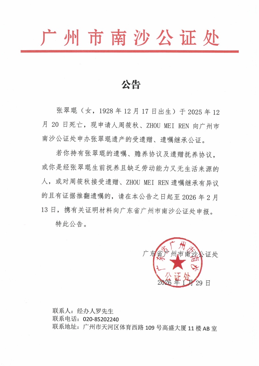 关于周筱秋接受张翠琨遗赠、ZHOU MEI REN继承张翠琨遗产的公告