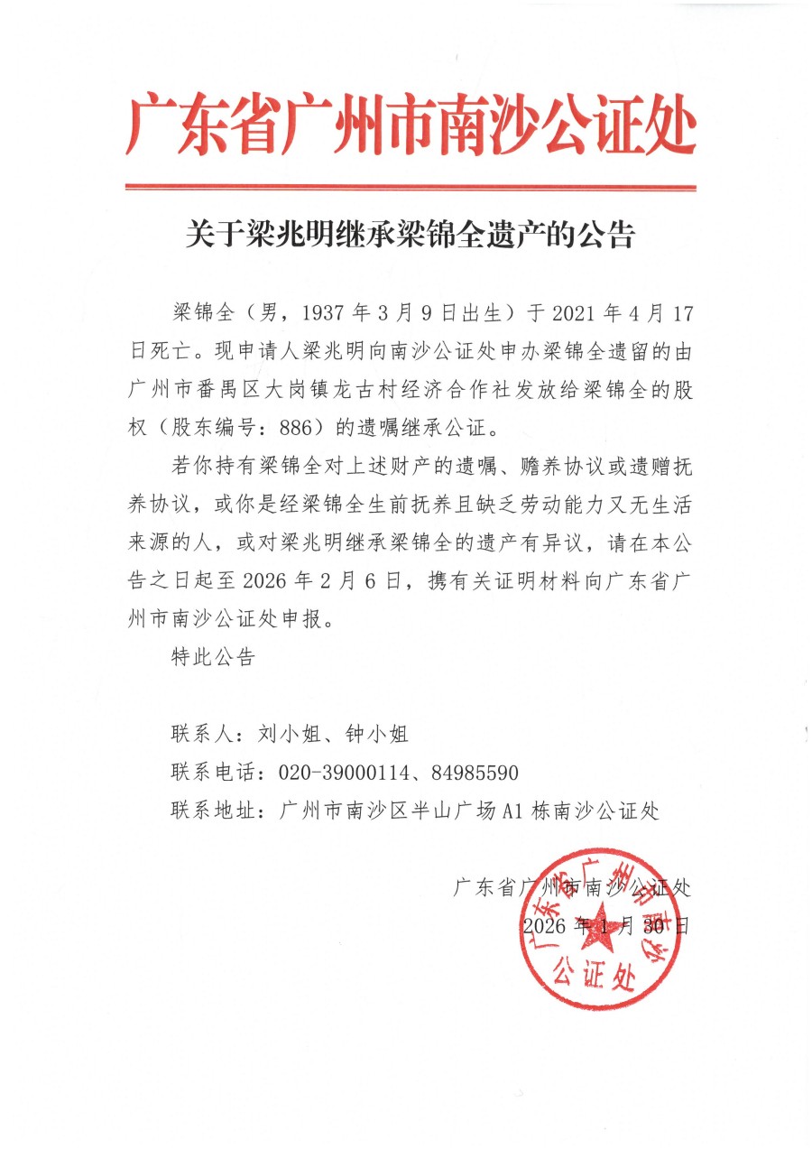 关于梁兆明继承梁锦全遗产的公告