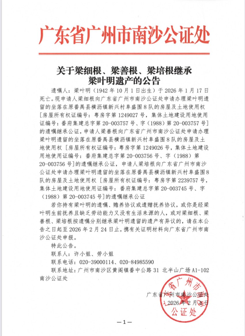 关于梁细根、梁善根、梁培根继承梁叶明遗产的公告