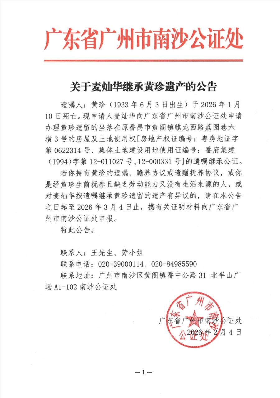 关于麦灿华继承黄珍遗产的公告
