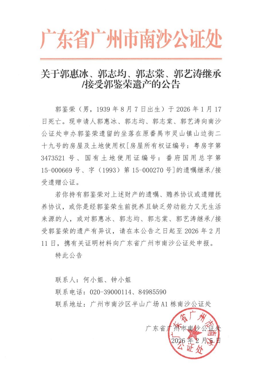 关于郭惠冰、郭志均、郭志棠、郭艺涛继承/接受郭鉴荣遗产的公告