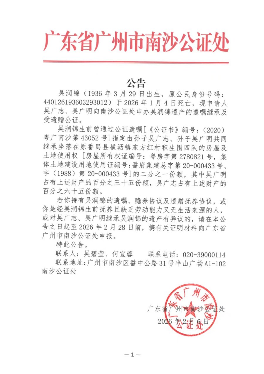关于吴广志、吴广明继承吴润锦遗产的公告