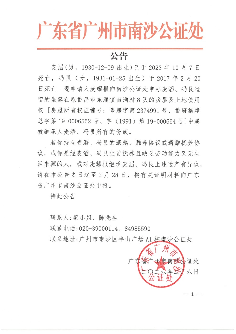 关于麦耀根继承麦滔、冯艮遗产的公告