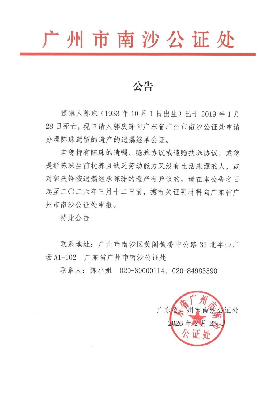 关于郭庆锋继承陈珠遗产的公告