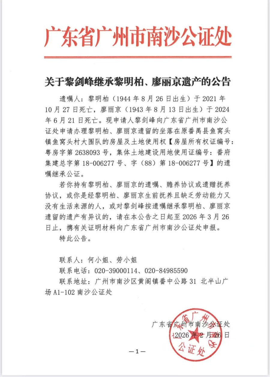 关于黎剑峰继承黎明柏、廖丽京遗产的公告