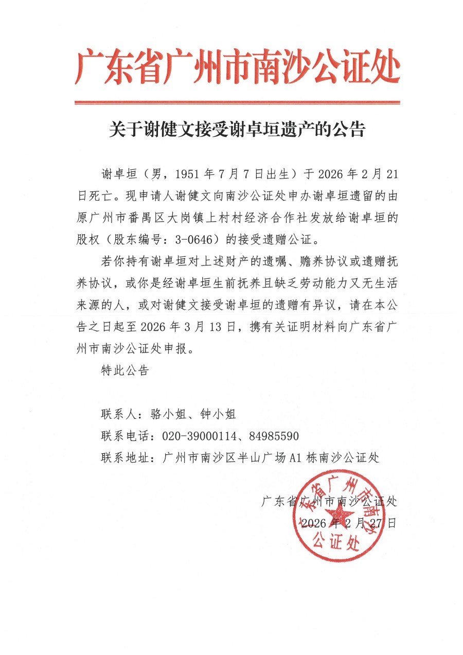 关于谢健文接受谢卓垣遗产的公告