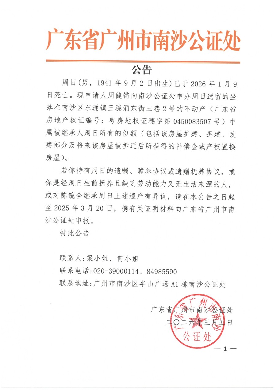 关于周健锵继承周日遗产的公告