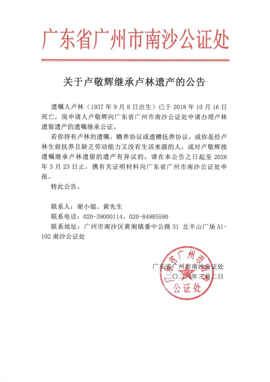 关于卢敬辉继承卢林遗产的公告