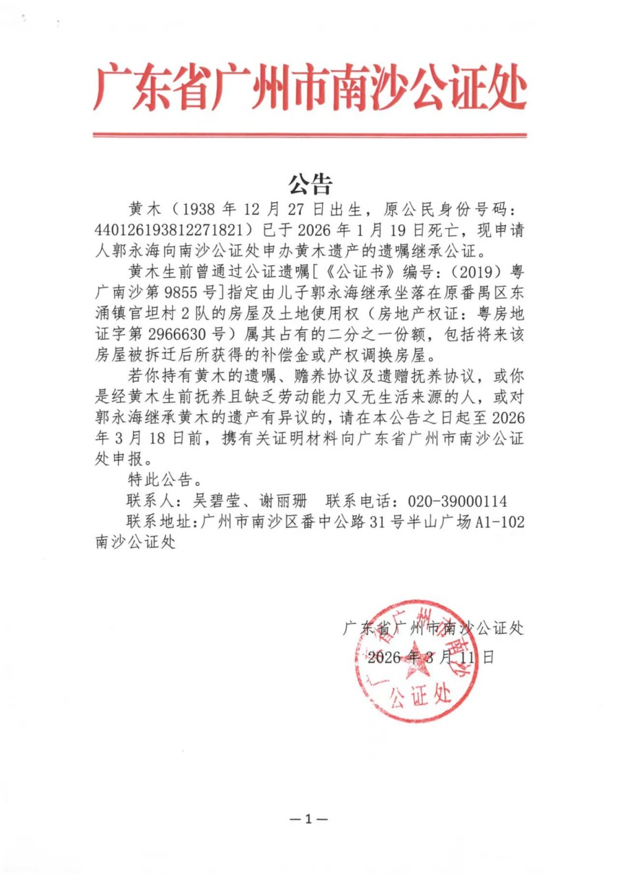 关于郭永海继承黄木遗产的公告
